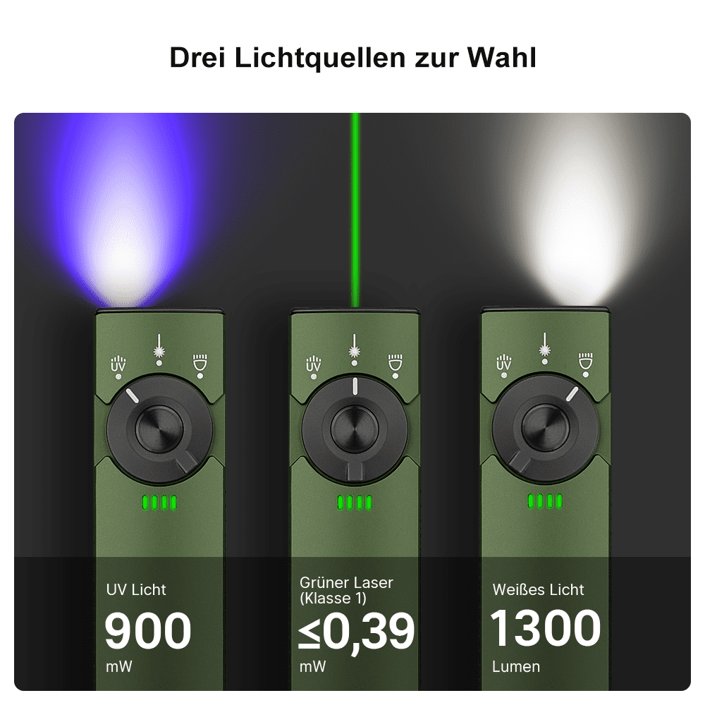 Die tragbare EDC-Taschenlampe Arkfeld Pro bietet drei Lichtquellen, die weißes Licht mit 1300 Lumen, einen grünen 520-nm-Laser und ein leistungsstarkes 900-mW-Schwarzlicht mit einer Wellenlänge von 365 nm kombinieren. Dies sorgt im Vergleich zu herkömmlichen 395-nm-UV-Lichtern für ein reineres und professionelleres UV-Lichterlebnis. Dank des intuitiven kreisförmigen Wahlschalters ist das Umschalten zwischen den drei Beleuchtungsmodi mühelos und ermöglicht es dem Benutzer, seine Beleuchtung mit einem schnellen Handgriff an seine spezifischen Bedürfnisse anzupassen.