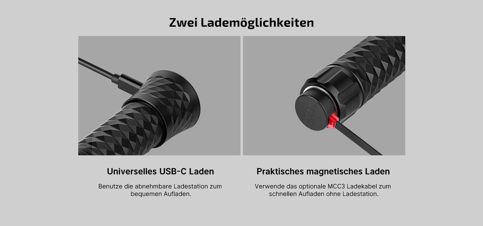 Das Aufladen der Prowess ist dank der Lademöglichkeit über USB-C oder magnetisch mit dem optionalen MCC3 Ladekabel sehr flexibel. Befestige einfach die abnehmbare Ladestation oder das magnetische Kabel und die Taschenlampe ist schnell wieder einsatzbereit. Der Akku muss zum Aufladen nicht herausgenommen werden. Die schnelle und effiziente Ladefunktion sorgt dafür, dass du weniger Zeit mit Warten verbringst und mehr Zeit damit, die brillante Beleuchtung der Prowess zu bewundern. Egal, ob du zu Hause, im Auto oder unterwegs bist - die Prowess macht das Aufladen mühelos und komfortabel.