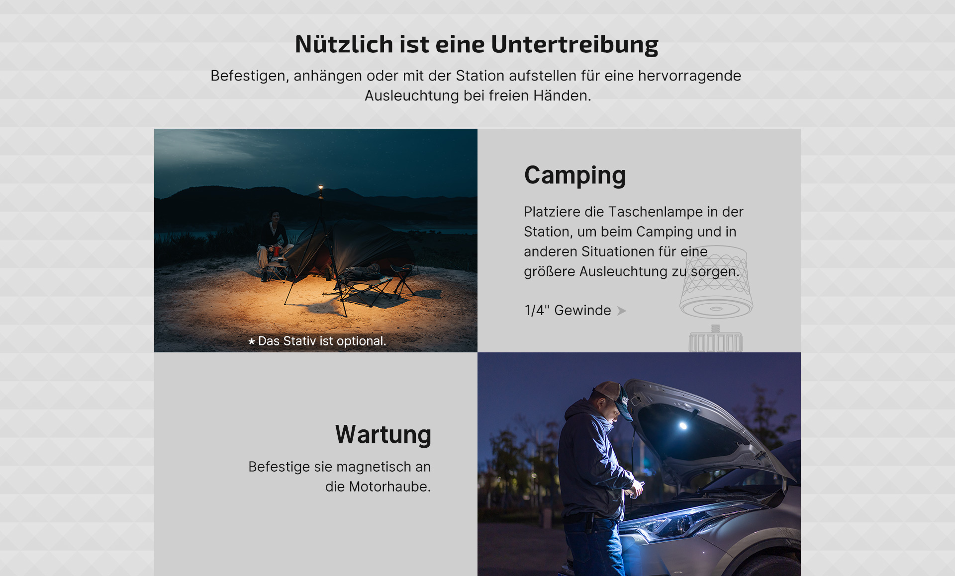 Das vielleicht bemerkenswerteste Merkmal der Prowess ist ihre Vielseitigkeit. Sie eignet sich als Taschenlampe für Abenteuer im Freien, Schreibtischlampe für nächtliche Lernsessions oder Campinglampe für Abende unter dem Sternenhimmel. Mit ihrer magnetischen Endkappe, Kompatibilität mit einem Stativ und der Option der Wandmontage sind die Möglichkeiten fast endlos. Durch ihr kompaktes und leichtes Design lässt sie sich überallhin mitnehmen und transportieren, während ihre robuste Konstruktion dafür sorgt, dass sie den täglichen Strapazen standhält. Egal, ob du den perfekten Einsatzzweck für diese Taschenlampe hast oder einfach handwerkliche Qualität zu schätzen weißt, die Prowess ist eine vielseitige Beleuchtungslösung, die sich an deinen Lebensstil und deine Bedürfnisse anpasst.