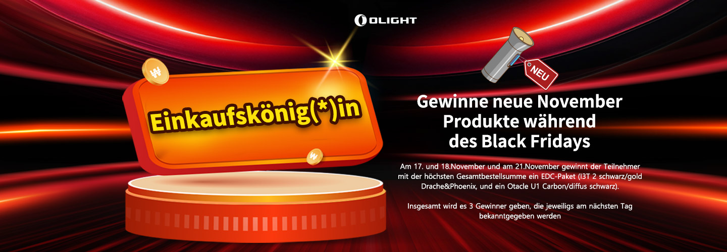 Shoppingkönig:Am 17. und 18.November und am 21.November gewinnt der Teilnehmer mit der höchsten Gesamtbestellsumme ein EDC-Paket (I3T 2 schwarz/gold Drache&Phoenix, und ein Otacle U1 Carbon/diffus schwarz).