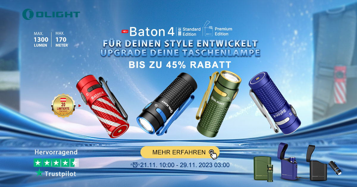 Die Baton 4 Premium Edition umfasst das Baton 4 und eine maßgeschneiderte Ladehülle. Das maßgeschneiderte Ladeetui verfügt über einen eingebauten 5000mAh 21700 Akku, mit dem Sie das Baton 4 bis zu fünf Mal vollständig aufladen können, was eine Laufzeit von bis zu 190 Tagen für das Baton 4 bedeutet. Mit verbesserter Leistung und Komfort ist das Baton 4 Premium Edition ein idealer Begleiter für alle Ihre Beleuchtungsbedürfnisse.