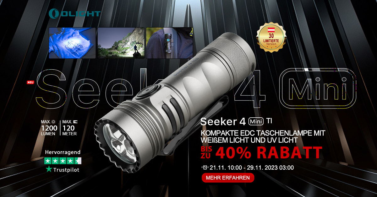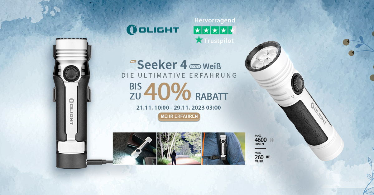 Die Seeker 4 Pro verfügt über eine unglaubliche maximale Lichtleistung von 4600 Lumen und eine Leuchtweite von 260 Metern. Das sind 400 Lumen mehr als bei der Vorgängerin Seeker 3 Pro, da die Schaltkreiseffizienz erhöht wurde, ohne die Laufzeit des mitgelieferten 5000mAh 21700 Akkus zu beeinträchtigen. Der vergrößerte Seitenschalter aus Metall bietet einen besseren Halt und flüssigere stufenlose Helligkeitseinstellung, die auch mit dicken Handschuhen leicht zu bedienen ist. Erstmals in der Taschenlampenbranche wird Lasermikroperforationstechnologie eingesetzt, um mit kleinen Löchern auf dem Metall eine unverwechselbare, durchsichtige Leistungs- und Ladestandsanzeige zu erzeugen. Zusätzlich wurde diese verbesserte Version mit einem branchenführenden, innovativen Holster ausgestattet, das die Taschenlampe automatisch ver- und entriegelt, auflädt, aufbewahrt und transportiert. Wenn sich die Taschenlampe im Holster befindet, senkt sie die Helligkeit zur Sicherheit intelligent auf unter 600 Lumen. Es kann außerdem für das bevorzugte Lichtergebnis zwischen zwei verschiedenen Farbtemperaturen gewählt werden: Kaltweiß (5700K~7000K) oder Neutralweiß (4000K~5000K). Genieße das ultimative Erlebnis mit der Seeker 4 Pro!